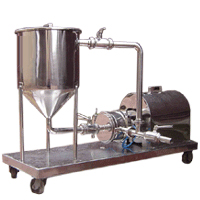 PUMPING ACTION : Because of indigenous design & rotor operating at very high speed in close clearance with stator draws the material in & imparts mechanical & shearing actions. Inline Homogenizer facilitates high volume, non positive action which is sufficient to transfer the material without any supplementary pumps but in some cases because of high viscosity, vertical lift or length of pipe line , the flow rate may come down below the anticipated value, In that case it is supplemented by an auxiliary pump installed in the system which pumps the liquid without reducing the homogenising/emulsifying efficiency of the system.